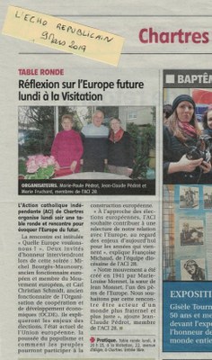 -Françoise Michaud, responsable diocésaine de l’ACI et sur le plan national, responsable de la commission internationale de l’ACI, s'est fait l 'echo d'une intervention du Père Catta Jésuite pour exprimer en quoi nous sommes concernés comme chrétiens par l'Europe ? Le pape François dans plusieurs discours ( au parlement européen, au Conseil de l'Europe et devant les évêques représentant chaque pays de UE) a beaucoup parlé sur le rôle des chrétiens en Europe, à savoir redonner une âme à l'Europe pour entrer en dialogue avec d'autres, croyants ou non, pour construire ensemble un projet commun.
