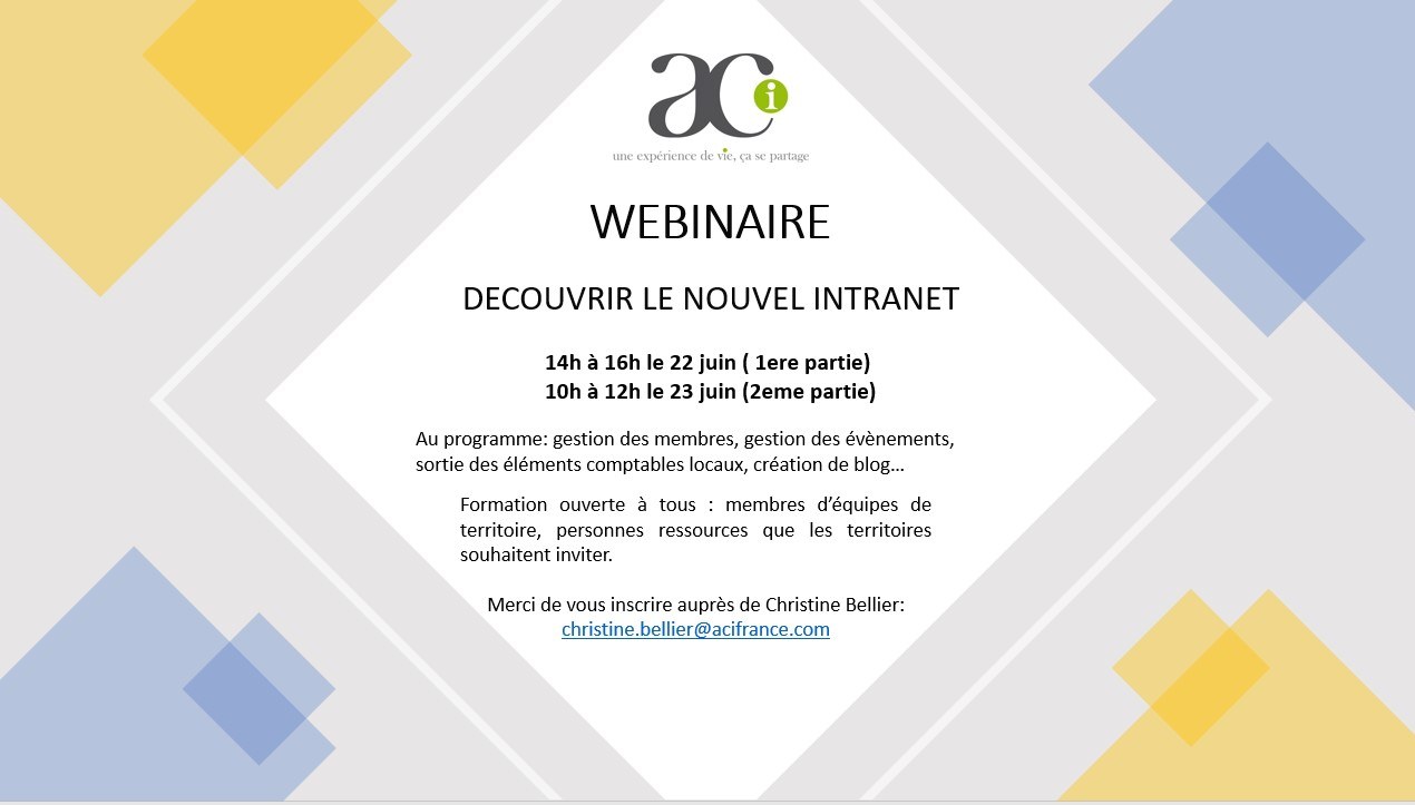 - Webinaire 1, le 22 juin de 14h à 16h : https://app.livestorm.co/assoconnect-3/webinaire-1-aci-gestion-des-membres-et-blog