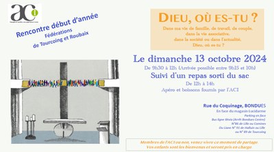 Les fédérations de Tourcoing et Roubaix se sont retrouvées le 13 octobre 2024 pour démarrer l’année. Il a été décidé de ne pas faire une présentation des thèmes d’enquête et de méditation, mais de se poser la question « Dans notre vie de famille, de travail, de couple, dans la vie associative et dans l’actualité ; Dieu, où es-tu ? »