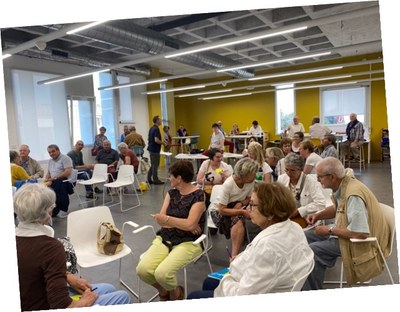 Puis nous sommes allés au 2ème étage où nous avons continué notre rencontre autour du thème « Dialoguer pour mieux construire ensemble ». En carrefours de 3 personnes, chacune a pu dire pendant 1mn un mot qui résumait ce que l’on avait entendu et découvert de ce tiers lieu pédagogique en expliquant le choix de ce mot. Chaque minute, une cloche permettait de donner la parole à la seconde personne, puis à la troisième personne du carrefour. Quelques mots partagés : Innovant, créatif, surprenant, accueillant, mixité, cohésion, étonnant, ouverture, construction, ...
