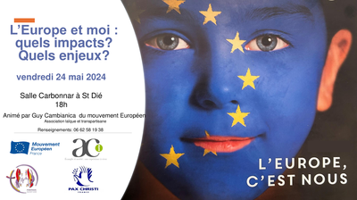 Le territoire de St Dié vous invite le vendredi 24 mai pour une soirée d'échanges autour de nos questionnements vis-à-vis de l'Europe et la façon dont nous sommes acteurs dans la construction européenne.
