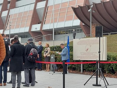 Cette cérémonie s’est déroulée devant la Dalle d’ATD Quart Monde. Discours du Président de la Conférence des OING et de la Secrétaire Générale du Conseil de l’Europe.