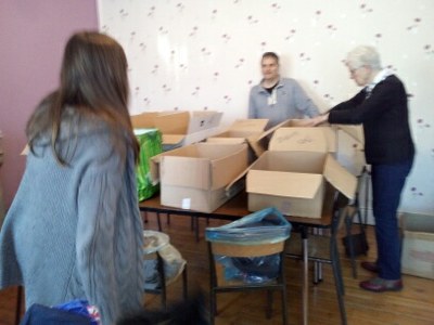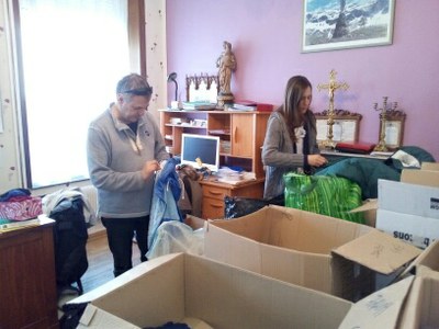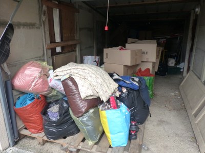 - notre prêtre accompagnateur d'équipe ( Jean Pierre BOUTOILLE, le " curé des Migrants"), laisse en permanence son garage ouvert, des gens y déposent des sacs de fringues pour les Migrants de Calais ( nous sommes à Boulogne sur Mer, à 40 kms de Calais ) ; un samedi par mois, Vincent ( un coéquipier ACI ) organise le tri avec quelques personnes ( dont une majorité de coéquipiers ACI ), pour préparer des colis ( les caisses carton sur la deuxième photo ), à destination de l'Auberge des Migrants . Le reste des fringues est dispatché entre la Croix Rouge et d'autres circuits de retraitement.L'idée est de continuer un engagement en direction des migrants, car à l'époque de la Jungle de Calais, notre équipe s'était investie ( plusieurs repas organisés avec les Migrants de la Jungle ), mais Vincent et Sandrine , tous deux en ACI, s'était intensément investis. ( Sandrine, instit, tenait à tour de rôle, des journée d'enseignement à l'école de la Jungle, Vincent y allait 3-4 fois par semaine ..)
